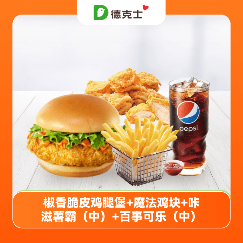 【账号直充】德克士单品兑换券『椒香脆皮鸡腿堡+魔法鸡块+咔滋薯霸(中)+百事可乐(中)』